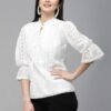 Set sail into the sunny days with this delicate lace top. Tailored with V-tie-up neck and gather details and features a puffed long sleeve with scalop edging . Pair with fitted pants and accesories and your favourite pair of heels and you’re good to go.